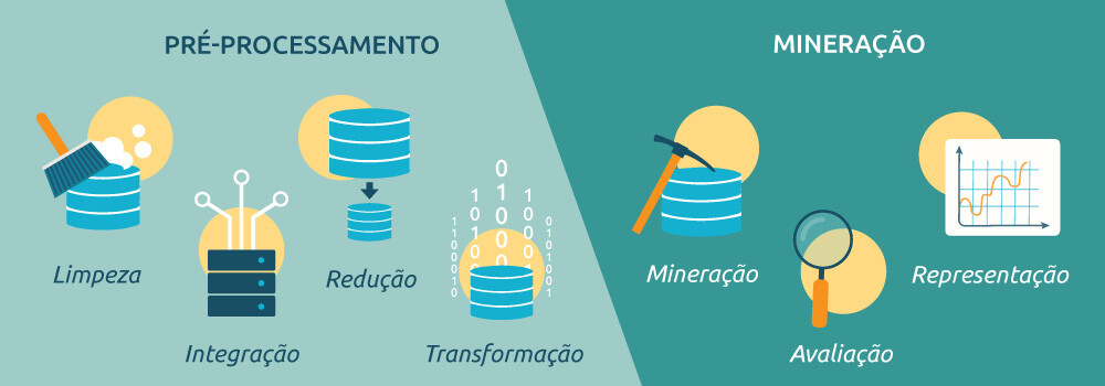 O processo de mineração possui 2 fases principais: O pré-processamento de dados: limpeza e integração de dados; redução e transformação de dados; e a mineração de dados: mineração, avaliação de padrões e representação de conhecimento de dados.